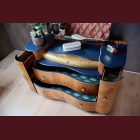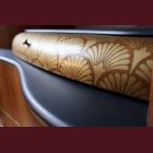 The curved drawer got a small Art Deco fan pattern — because a little glamour never hurt anyone. Open the drawers and there’s another surprise: Art Deco wallpaper lining the interiors, and soft felt in the small curved drawer for jewelry or other delicate things.