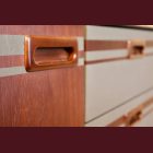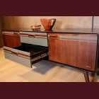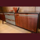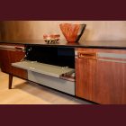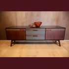 Originally a Dutchbone TV stand, now refreshed into a statement sideboard with a cool mid-century feel. The top and sides have been repainted in black, while the front was redesigned in a new colour-block pattern of warm walnut tones and a soft grey-green. It’s a solid, well-built piece — two doors, two drawers, plenty of storage — and heavy enough to feel like real furniture. The finish brings out the grain while keeping a clean, modern edge. Perfect for use as a TV stand, sideboard, or drinks cabinet.