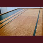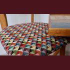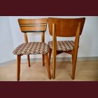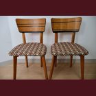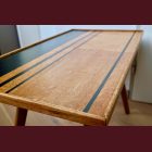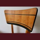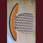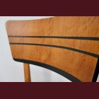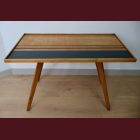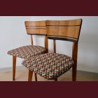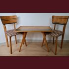 The set comes with two vintage MCM chairs and a matching compact table with a raised edge. The chairs wear their new geometric upholstery proudly, and the table has hand-painted deep-green striping paired with a lightly bleached veneer top. The whole set is finished with Osmo, giving it that smooth, matte, durable feel.
