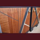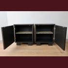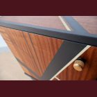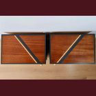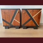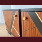 Post-WWII craftsmanship at its most elegant. These twin nightstands were rescued from decades of wear and lovingly brought back to life. The heavy, high-gloss varnish that once smothered the wood was stripped away, revealing the true beauty of the mahogany veneer beneath. Each surface was refinished by hand to highlight the depth and texture of the grain. The new geometric design, inspired by mid-century forms, adds a dash of modernity without losing the charm. The hardware was replaced with solid metal pulls in matte gold with black detail, a refined accent that complements the wood’s tone and the geometry of the fronts. Compact yet sculptural, these nightstands bring both history and presence into the room — perfect beside the bed or as small statement tables that prove subtlety can still turn heads.