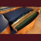 The curved drawer got a small Art Deco fan pattern — because a little glamour never hurt anyone. Open the drawers and there’s another surprise: Art Deco wallpaper lining the interiors, and soft felt in the small curved drawer for jewelry or other delicate things.