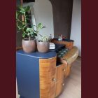 The sculptural curves were finished in Midnight Blue, while the walnut veneer was brought back to life with Osmo hardwax oil so the grain really pops.
